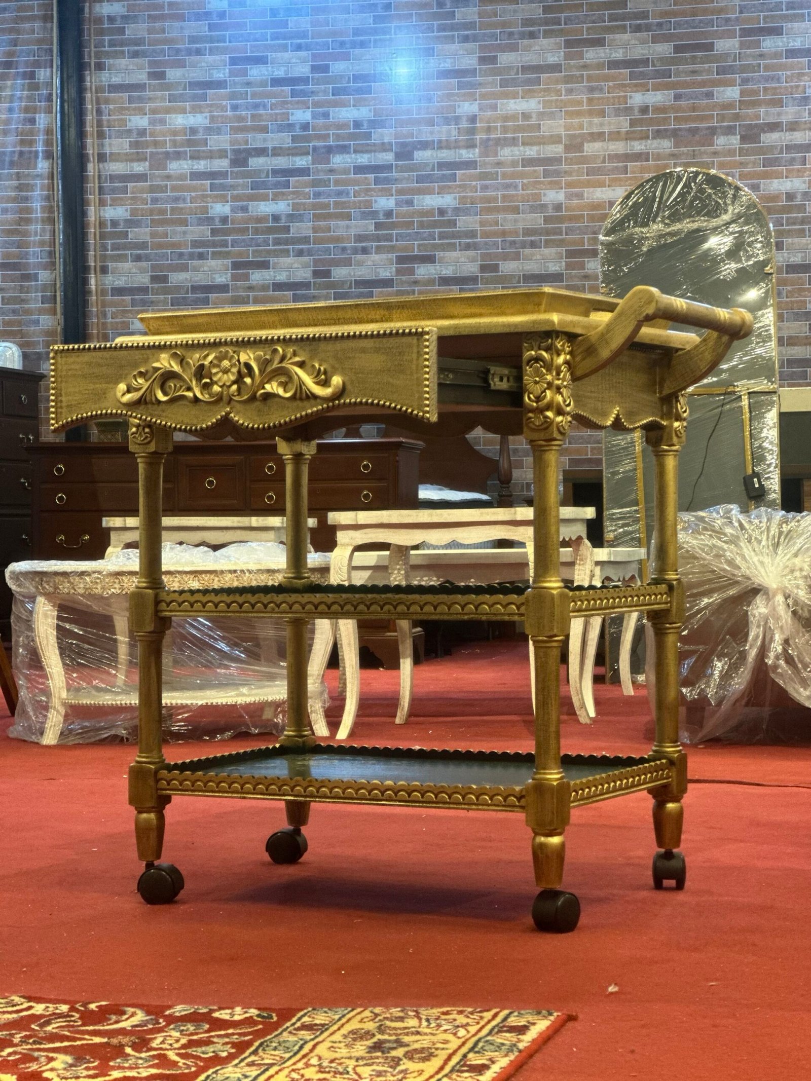 Designed with three spacious shelves and smooth-rolling wheels, this trolley is ideal for use as a tea trolley, bar cart, serving trolley, or decorative accent piece for living rooms, dining areas, or luxury spaces. The sturdy handle and carved wooden detailing add a classic, premium touch.