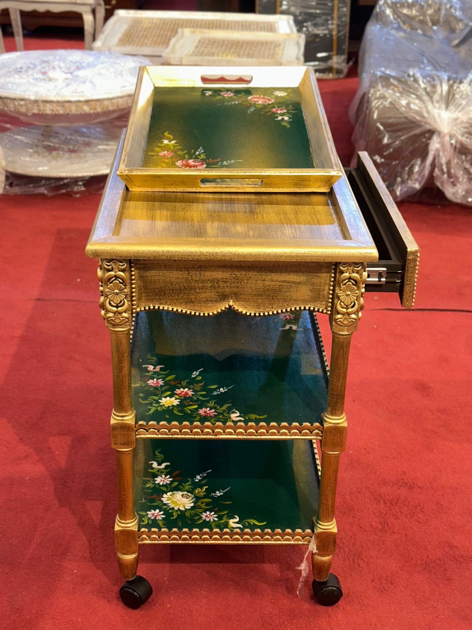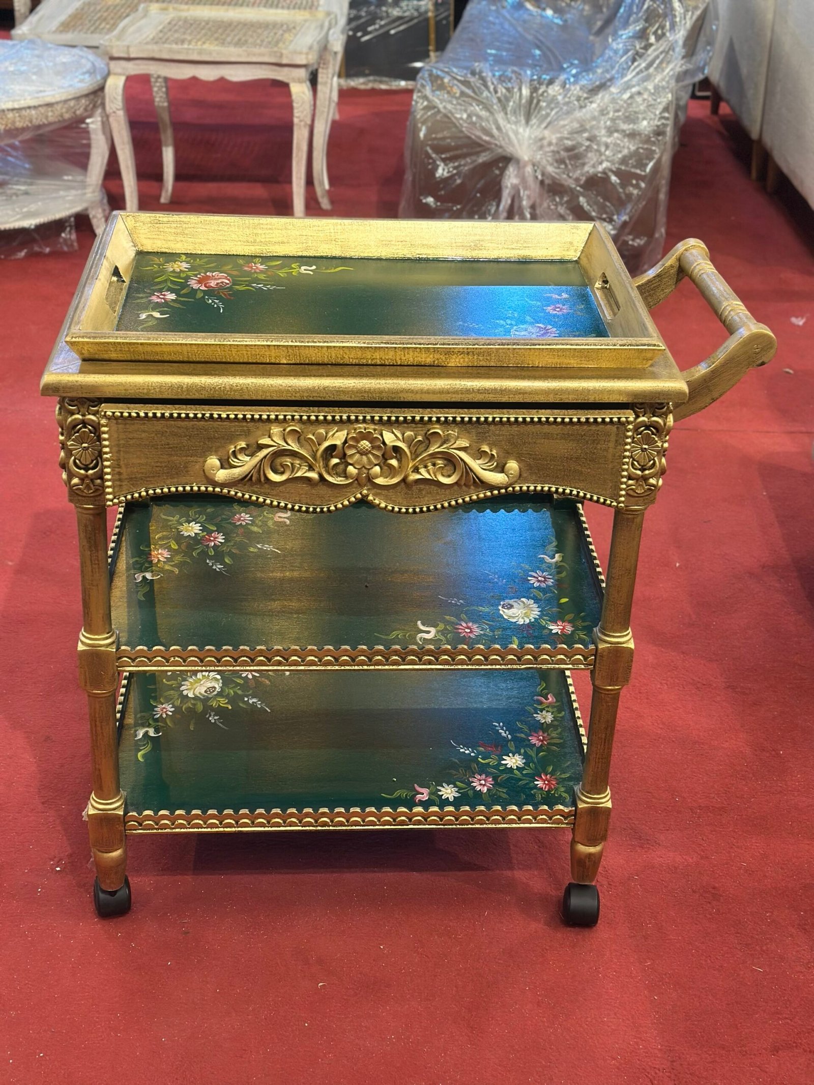 This handcrafted wooden serving trolley cart is a statement piece that combines elegance, craftsmanship, and practicality. Made from high-quality solid wood, it features beautiful hand-painted floral artwork on multiple tiers, finished in a rich antique gold and green tone.
