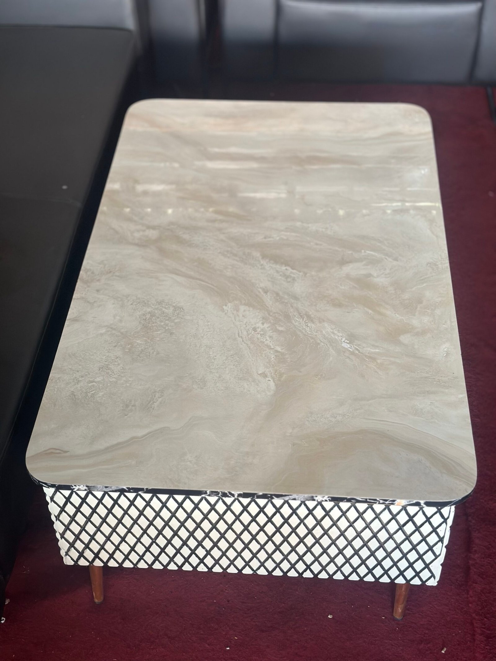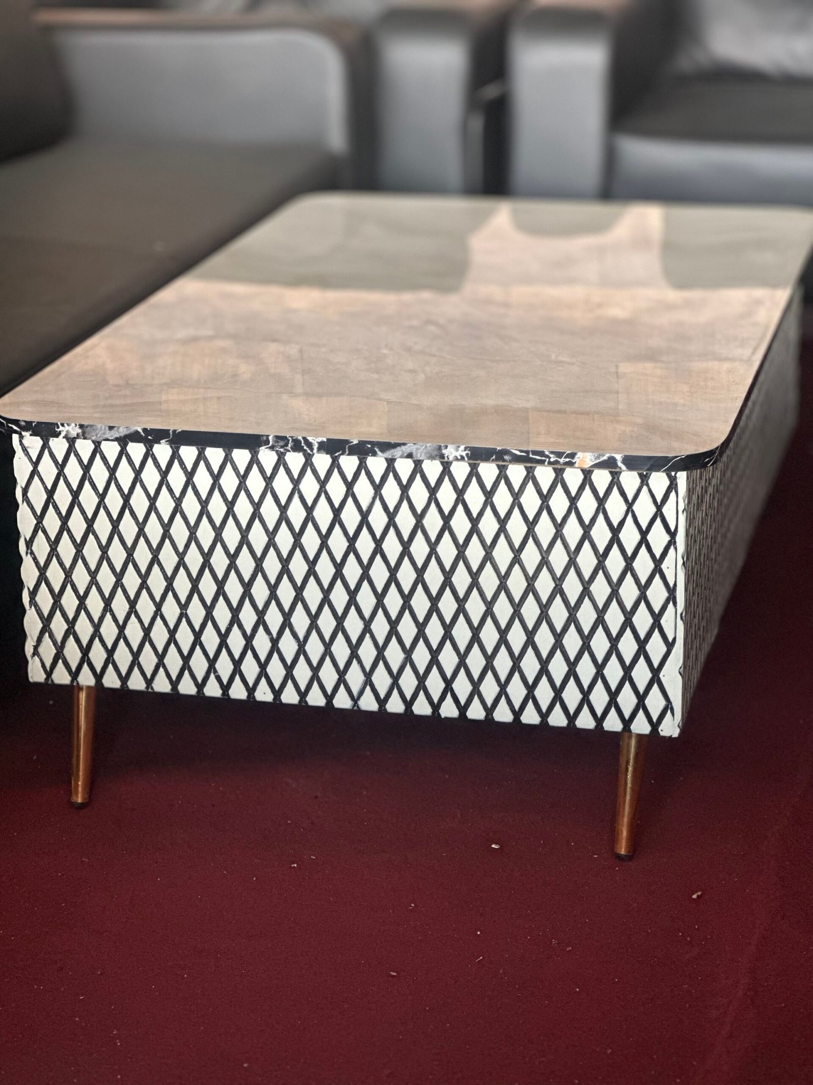 Geometric base, mid-century modern, living room furniture, rectangular center table, black and white lattice.