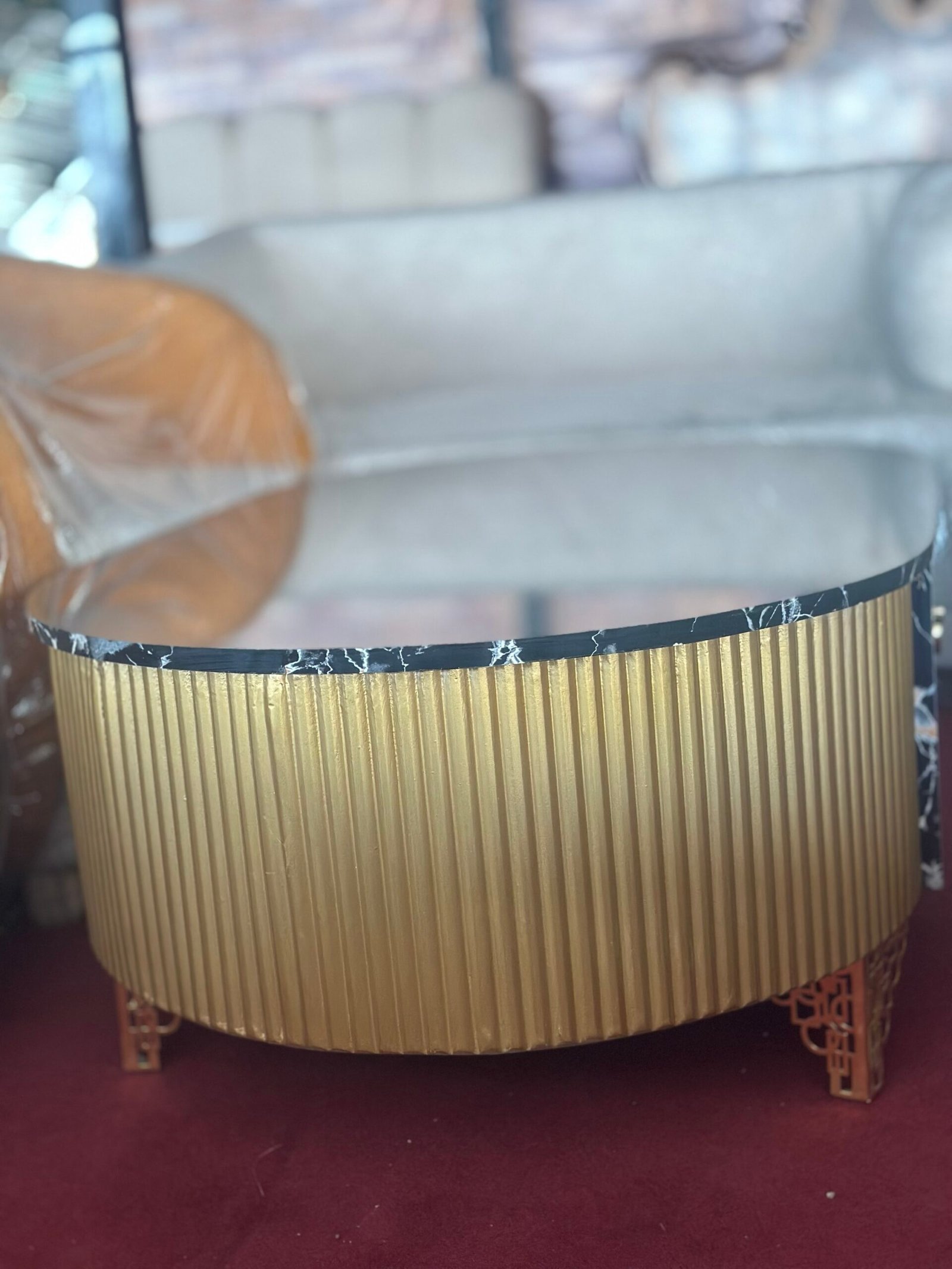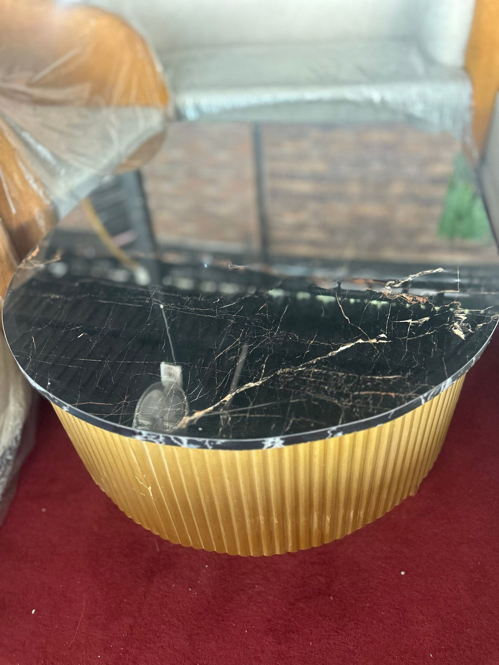 Bring elegance and luxury to your home with this modern round coffee table featuring a premium black marble top with natural veining and a stylish gold fluted base. Designed to be both durable and eye-catching, this center table offers a spacious surface for décor, tea service, and everyday use. Its contemporary design makes it perfect for living rooms, lounges, offices, and reception areas. Strong construction, easy to clean, and crafted to add a high-end look to any interior.