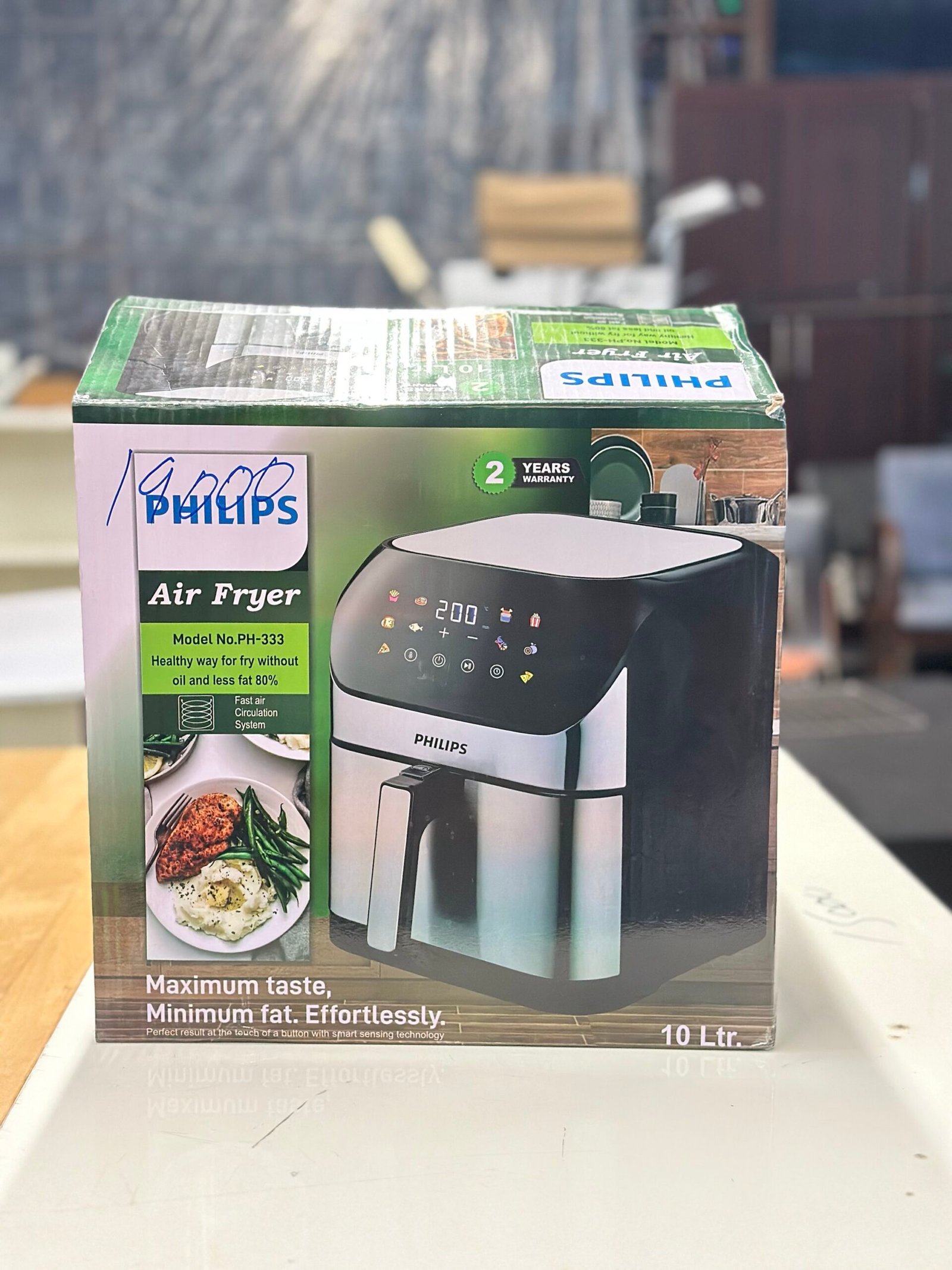 Experience healthy and delicious cooking with the Philips 10 Litre Air Fryer (Model PH-333). Fry your favorite foods with up to 80% less oil using its advanced Fast Air Circulation System. Featuring a sleek digital touch panel, this air fryer offers effortless cooking with smart sensing technology. Ideal for families, it comes with a generous 10L capacity and a 2-year warranty. Perfect for guilt-free frying, baking, grilling, and roasting.