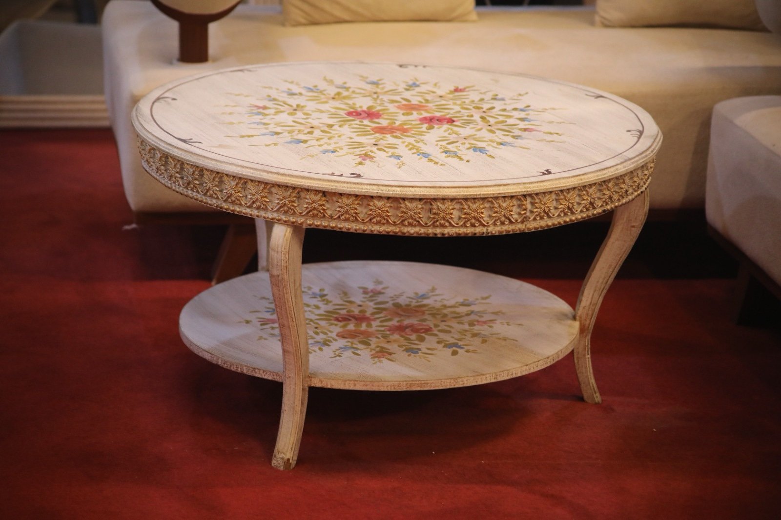 Enhance your living room with this round wooden coffee table featuring a beautiful hand-painted floral design and elegant carved detailing. Perfect as a center table, coffee table, or accent table for lounges and sitting areas. Strong wooden construction with a classic antique finish adds charm and durability to your space.