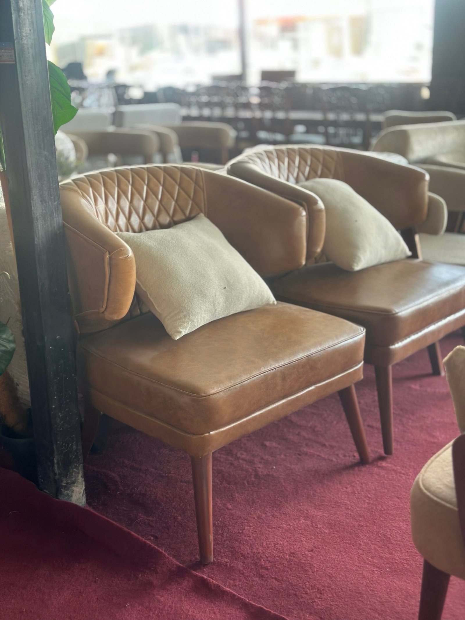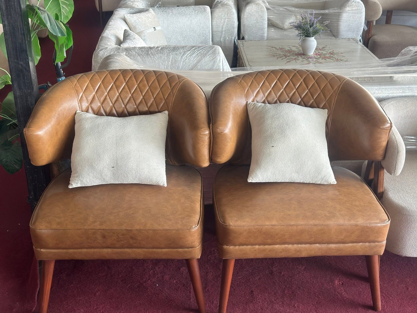 Add elegance and comfort to your space with this set of 2 luxury leather accent chairs featuring a stylish quilted backrest and soft cushioned seating. Upholstered in premium brown leatherette with a smooth finish, these chairs offer excellent support and a modern mid-century design. The sturdy wooden legs provide durability and stability, making them perfect for living rooms, lounges, offices, cafés, and waiting areas. Comfortable, classy, and built for everyday use, these chairs instantly enhance any interior décor.